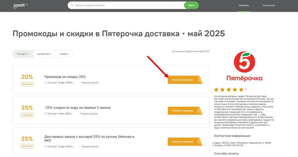 При покупках через официальный сайт Пятерочки процесс ввода промокода немного отличается: