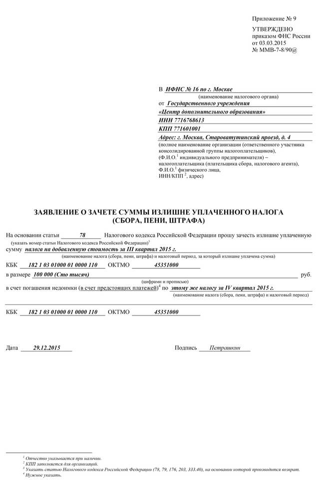 - Заявление о зачете переплаты