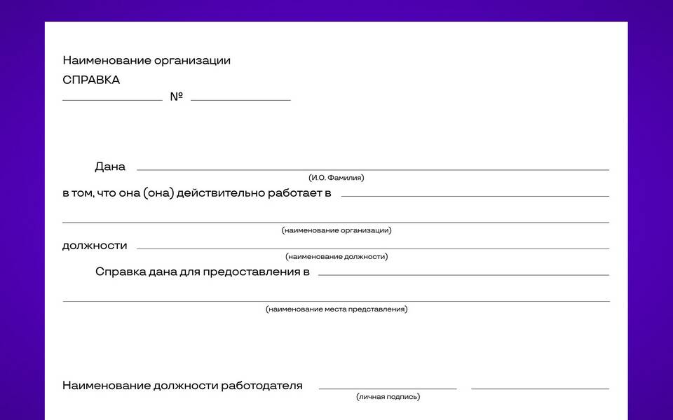 Настоящая справка дана [ФИО сотрудника] в том, что он(а) действительно работает в [название организации] в должности [название должности] с [дата приема на работу] по настоящее время.